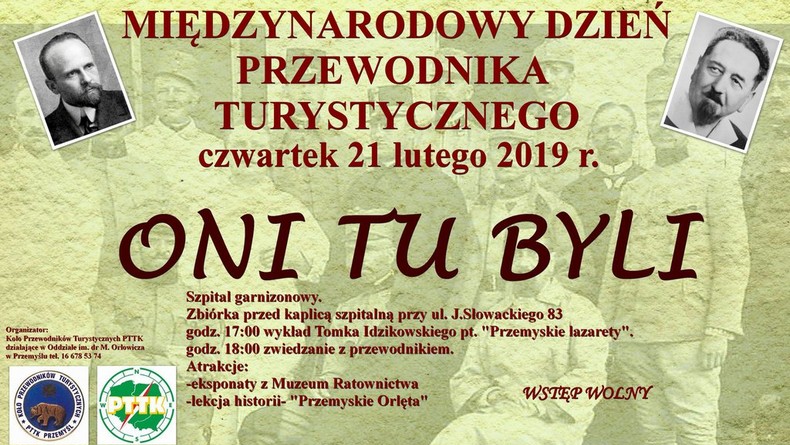 21 lutego PTTK Oddział Przemyśl zaprasza do poznania kolejnej budowli i historii z nią związanych pod hasłem "Oni tu byli". Zbiórka uczestników wydarzenia będzie miała miejsce przed kaplicą szpitalną przy ul. J. Słowackiego 83, a już o godz. 17.00 rozpocznie się wykład Tomka Idzikowskiego "Przemyskie lazarety". Od 18.00 nastąpi zwiedzanie szpitalnych obiektów z przewodnikami. Dodatkowymi atrakcjami będą eksponaty z Muzeum Ratownictwa w Krakowie Oddział w Przemyślu, które jest jednym ze współorganizatorów wydarzenia, a także lekcja historii "Przemyskie Orlęta".