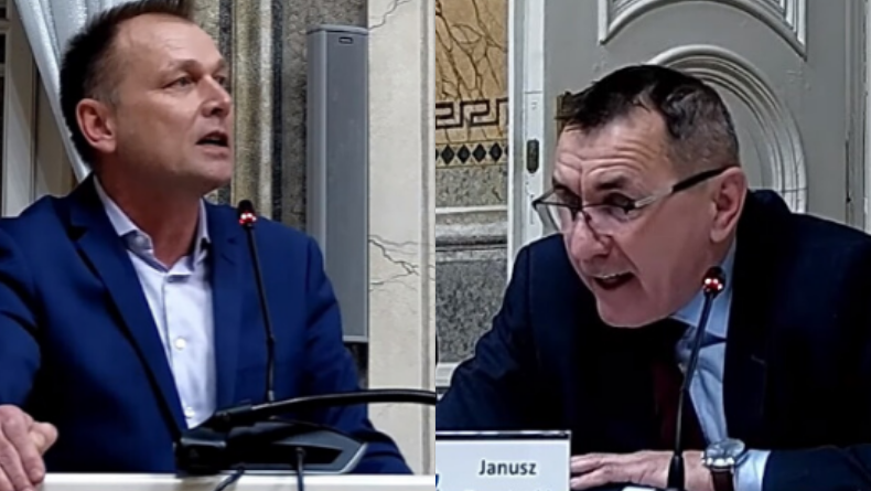 Podczas obrad koalicja wyświetliła film z czasów prezydentury R. Chomy o trudnej sytuacji MZK. Radny koalicyjnej PO, Wojciech Błachowicz (na zdj. po lewej) chwalił W. Bakuna i wskazywał, że nie ma porównania pomiędzy merytorycznym przygotowaniem obecnego prezydenta a Robertem Chomą. Błachowicz nadział się jednak na ,,szpilę” J. Zapotockiego (na zdj. po prawej) i M. Kamińskiego, którzy przypomnieli, że to właśnie za czasów R. Chomy Błachowicz był wiceprezydentem, a w ostatniej kampanii obiecywał darmowe przejazdy autobusami dla młodzieży.