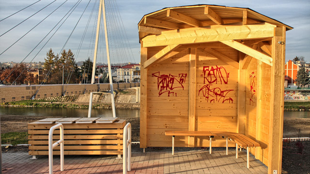 Kładce, od strony wybrzeża Marszałka Józefa Piłsudskiego towarzyszy dodatkowa infrastruktura w postaci altanek  z ławeczkami. Jedna z nich została ohydnie pomalowana czerwoną farbą. Szkaradztwo to  nie będzie raczej łatwe do usunięcia, gdyż surowe i jeszcze nie zabezpieczone żadnym lakierem wpiło farbę nie wiadomo jak głęboko.