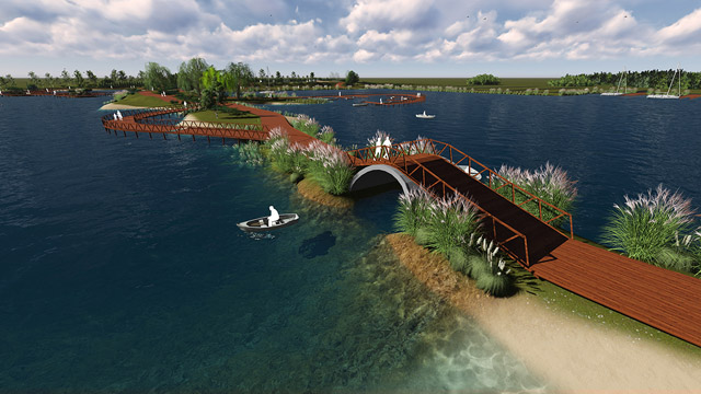 Projektantka założyła, że większy zbiornik wodny znajdujący się na żwirowni będzie pełnił funkcję szybszego jeziora, po którym bez problemu będą mogły pływać łódki lub żaglówki, tam też przewidziana została dla nich przystań. Drugi zaś mniejszy przeznaczony będzie pod kąpiele wodne, z wydzieloną strefą dla rodzin, w miejscu w którym jest niski spad. Wykorzystana została wyspa, która tam istnieje naturalnie, dwie kolejne zostałyby nasypane. Oba jeziora łączy mostek, na tyle wysoki aby korzystający z łódek i rowerów wodnych mogli bez problemu przepłynąć pod nim. Projekt obrazuje również molo i deptaki, które po zapadnięciu zmroku byłyby podświetlane.