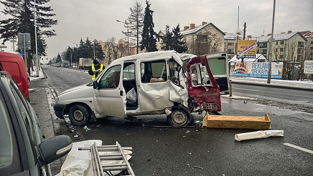 Wyjeżdżający z parkingu kierowca citroena próbował dostać się na przeciwległy pas ruchu. Niestety nie zauważył nadjeżdżającej ciężarówki Volvo, która uderzyła w tył pojazdu. Siła uderzenia była tak duża, że odrzucony citroen uderzył w stojące na parkingu dwa samochody. Zawartość samochodu została rozrzucona na przestrzeni ponad 100 metrów. W wyniku uderzenia ucierpiał niefrasobliwy kierowca, którego w stanie nieprzytomnym przewieziono do szpitala.