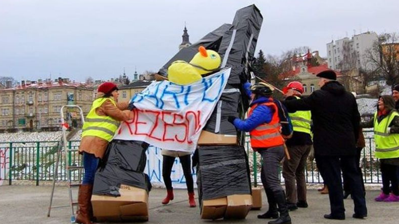 Wśród happenerów byli radni rady miejskiej: Ewa Sawicka i Tomasz Schabowski, głównym organizatorem zaś była Anna Grad-Mizgała, najbardziej rozpoznawalna osoba z kręgu Rebeliantów Podkarpackich. Podczas zabawy zbudowano z tekturowych pudeł atrapy wież, pomiędzy którymi umieszczono dmuchaną kaczkę.