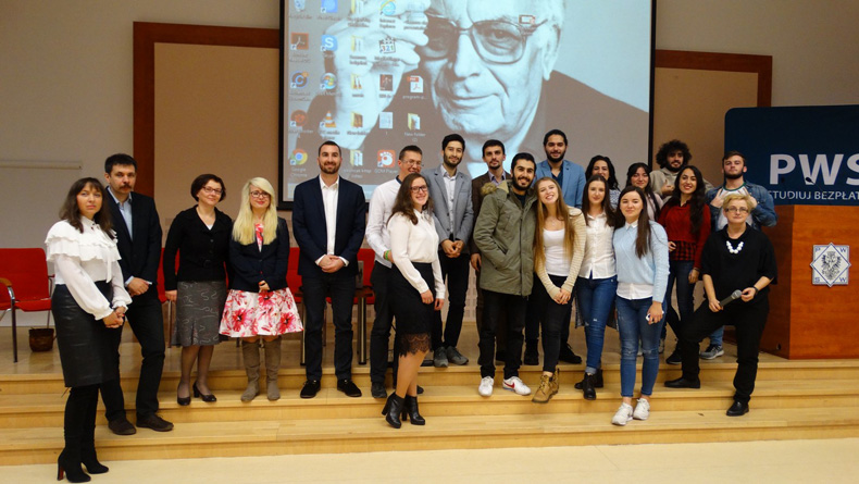 7 listopada, na 30 lecie programu Erasmus+ uczelnia zorganizowała Międzynarodowy Dzień Erasmusa przy udziale i wsparciu prorektora ds. rozwoju i współpracy dr. Sławomira Soleckiego. Studenci i uczniowie przemyskich szkół usłyszeli historie studentów z różnych krajów. Turcy, Elif Bilen i Ozgur Direk przedstawili historię i kulturę swojego kraju. Agnieszka Gurba i Zoriana Kindrat opowiedziały o czasie spędzonym na uniwersytecie Egerze, o podróżach poza Węgry w wolnym czasie a także o studiowaniu na Węgrzech wraz z Zsoltem Biczo, który z uczelni węgierskiej przyjechał studiować w ramach programu Erasmus+ do PWSW. Agnieszka Bieniek-Wydrzyńska opowiedziała o życiu w Macedonii i studiowaniu na uniwersytecie w Stipie i wysokim poziomie nauczania na macedońskiej uczelni, a także o tym, jak trudno w Macedonii o … warzywa! Studentki stosunków międzynarodowych, Nataliia Yurchyk, Diana Babunych i Yuliia Kubrak przeniosły gości do gorącej Portugalii, wspominając liczne wyprawy organizowane przez partnerską dla przemyskiej uczelni w Bradze i życzliwości Portugalczyków, którzy bardzo chętnie pomagają turystom i studentom. Oleksandr Shulhin, student mechatroniki, przeniósł nas do tureckiego Corum, w którym nie tylko studiował, ale i uczestniczył w życiu studenckim, ucząc się tureckich tańców i reprezentując uczelnię w licznych projektach wolontariatu organizowanych na terenie Turcji. Zaproszeni goście poznali również historię Mahmouda Nasefa z Egiptu, którego wiosna arabska zmusiła do wyjazdu z rodziną do Turcji, gdzie dziś studiuje stosunki międzynarodowe, z powodzeniem ucząc się języków obcych. Państwowa Wyższa Szkoła Wschodnioeuropejska, nazwa, którą nauczył się wymawiać z perfekcyjną starannością, nie stanowi dla niego wyzwania! Młody Egipcjanin był ciekaw, czy zebrani goście znają współczesne postacie kultury i polityki z Egiptu (prof. Jerzy Jarzębski, wykładowca kierunku filologia polska ratował honor zebranych, wymieniając zapomnianą gwiazdę kina Omara Sharifa), chętnie dzieląc się swoją trudną historią uchodźcy, z sukcesem funkcjonującym dziś na tureckiej uczelni i korzystającym z programów wymiany międzynarodowej wraz ze swoim przyjacielem, Azerem Karimem Karimli, który opowiedział zebranym historię Azerbejdżanu, zbliżoną w swej tragiczności do historii Polski – również podlegającej zaborom z ogromną diasporą żyjącą poza granicami kraju.