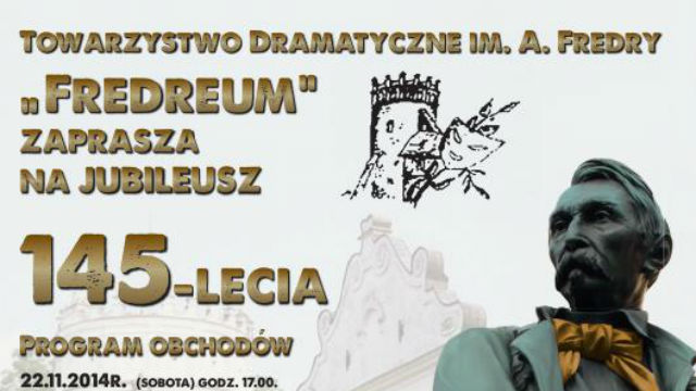 Towarzystwo Dramatyczne A. Fredry „Fredreum” zaprasza na swój jubileusz 145 -lecia. Obchody rozpoczną się w sobotę, 22 listopada o godzinie 17 na Zamku Kazimierzowskim, gdzie najpierw zostanie otwarta wystawa fotograficzna, a następnie w sali widowiskowej po wystąpieniach zaproszonych gości wystawiony zostanie spektakl teatralny A. Fredry „Pierwsza lepsza, czyli nauka zbawienna”, w reż. Krystyny Maresch – Knapek.