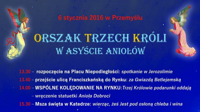 W środę, 6 stycznia do Przemyśla w asyście aniołów przybędzie orszak Trzech Króli. Początek wydarzenia o godz. 13.30 na Placu Niepodległości, skąd orszak przejdzie ul. Franciszkańską na Rynek Starego Miasta, gdzie odbędzie się wspólne kolędowanie. Tam też wręczona zostanie statuetka Anioła Dobroci. Święto zakończy Msza św. w przemyskiej Archikatedrze o godz.15.30