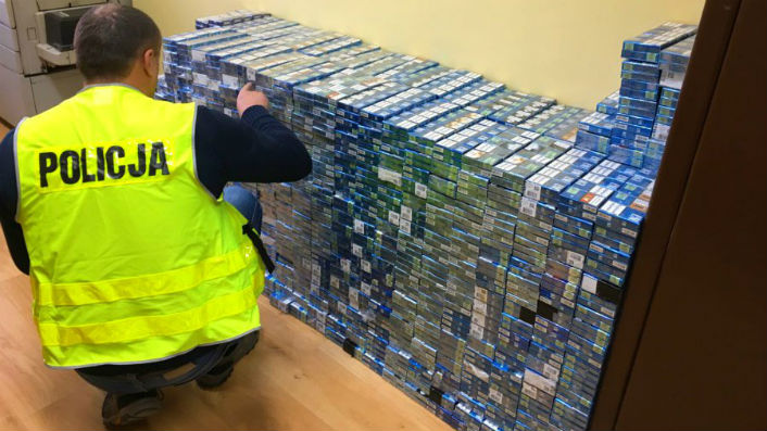 Przewoził w samochodzie 9338 paczek papierosów bez polskiej akcyzy. Wpadł podczas kontroli drogowej.
