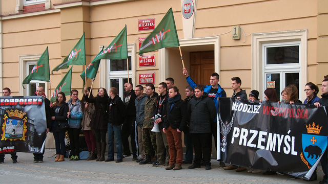 Manifestacja Ruchu Narodowego i Młodzieży Wszechpolskiej przed Urzędem Miejskim w Przemyślu