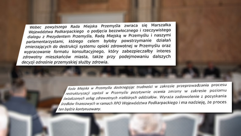 W czwartek 9 lutego, na wniosek PO zwołano nadzwyczajną sesję przemyskiej rady miejskiej, podczas której radni mieli głosować nad rezolucją dotyczącą sprzeciwu wobec niedotrzymania przez Zarząd Województwa ustaleń w zakresie łączenia szpitali. Po debacie, dzięki klubowi radnych PiS rezolucja przeszła… ale w brzmieniu zupełnie odwrotnym. Rada nadała jej oddźwięk pozytywny i popierający poczynania zarządu województwa.