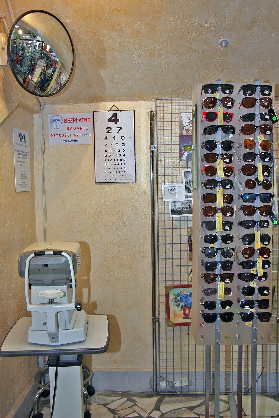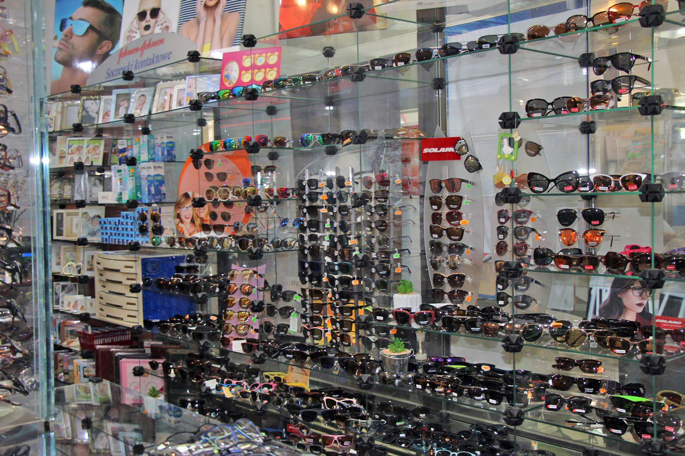 Stoisko „Foto Optyka” oferuje także okulary z progresywną soczewką – już od 390 zł za komplet, soczewki kontaktowe, a przez całe lato promocję 20% na szkła korekcyjne fotochromowe. Dostaniemy tutaj także różnego rodzaju dodatki jak etui na okulary czy też łańcuszki do nich, a także płyny i szmatki do ich czyszczenia. Sklep uwzględnia recepty ze zniżką NFZ. Na miejscu także przeprowadzane jest badanie ostrości wzroku.