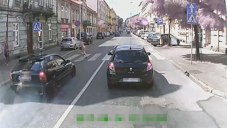 Zdarzenie miało miejsce 14 sierpnia br. tuż po godz. 12 na ul. Mickiewicza w Przemyślu. Na oznakowanym przejściu dla pieszych, 20-letnia kobieta przechodziła z prawej strony na lewą. Przed przejściem na prawym pasie zatrzymał się samochód osobowy i autobus MZK. W czasie, gdy piesza znajdowała się już na lewym pasie, na przejście wjechał z dużą prędkością kierujący hondą civic. Piesza odskoczyła gwałtownie na chodnik unikając uderzenia. Kierujący hondą nie zatrzymał się i odjechał ulicą Mickiewicza w kierunku ul. Jagiellońskiej. Całe zdarzenie zarejestrowane zostało przez kamerę monitoringu zainstalowaną w autobusie MZK.