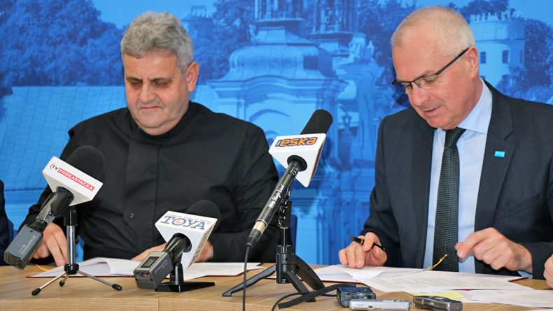 Podczas poniedziałkowej konferencji prasowej prezydent miasta Przemyśla Robert Choma podpisał z Antonim Barem, właścicielem Zakładu Usługowego Remontowo-Budowlanego umowę na realizację budowy sali gimnastycznej wraz z zapleczem przy Szkole Podstawowej nr 14 w Przemyślu.