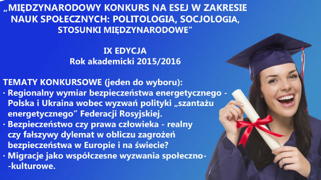 Instytut Nauk Społecznych Państwowej Wyższej Szkoły Wschodnioeuropejskiej w Przemyślu serdecznie zaprasza uczniów szkół gimnazjalnych do wzięcia udziału w IX edycji Międzynarodowego Polsko-Ukraińskiego „Konkursu na esej w zakresie nauk społecznych – politologii, socjologii i stosunków międzynarodowych”.