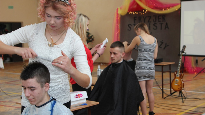 Młodzież z Zespołu Szkół Usługowo-Hotelarskich i Gastronomicznych charytatywnie wykonuje usługi fryzjerskie w Środowiskowym Domu Pomocy Społecznej w Przemyślu.