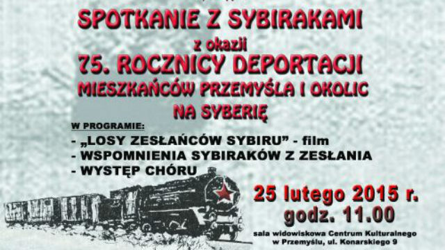 Związek Sybiraków Oddział w Przemyślu oraz przemyskie Centrum Kulturalne zapraszają do wzięcia udziału w spotkaniu z Sybirakami, które odbędzie się w ramach 75 -rocznicy deportacji mieszkańców Przemyśla i okolic na Syberię.