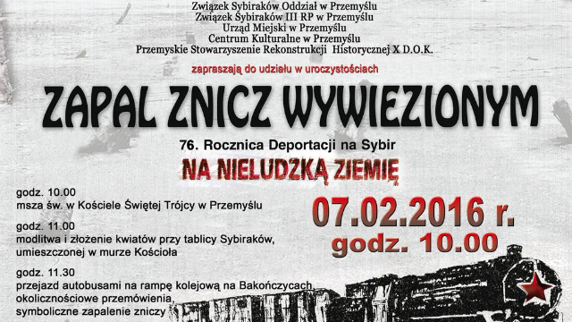W niedzielę, 7 lutego w Przemyślu odbędą się obchody 75 rocznicy deportacji Polaków na Sybir oraz 70 rocznicy powrotu zesłańców do Ojczyzny pod hasłem „Zapal znicz wywiezionym”.