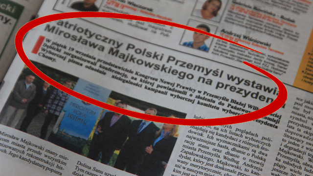 Biorąc dziś do ręki najnowszy numer Bramy Przemyskiej, czytelnik z pewnym zdziwieniem przeczyta artykuł na stronie trzeciej gazety. Tekst, sądząc z tytułu ma być relacją z konferencji prasowej Komitetu Wyborczego Wyborców Patriotyczny Polski Przemyśl. Jednak, już czytając zajawkę nie wiemy czy to artykuł o kandydacie Mirosławie Majkowskim czy Błażeju Wilku czyhającym na prezydenta Roberta Chomę.