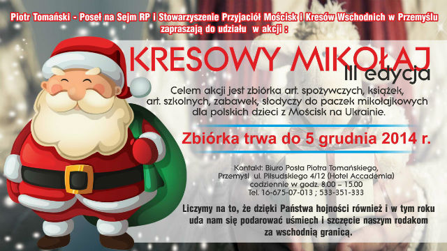 Poseł na Sejm RP Piotr Tomański i Stowarzyszenie Przyjaciół Mościsk i Kresów Wschodnich w Przemyślu zapraszają do udziału w akcji Kresowy Mikołaj. Celem akcji jest zbiórka artykułów spożywczych, książek, artykułów szkolnych, zabawek, słodyczy do paczek mikołajkowych dla polskich dzieci z Mościsk na Ukrainie. Zbiórka trwa do 5 grudnia. Dary można składać w biurze Piotra Tomańskiego, ul. Piłsudskiego 4/12 ( hotel Accademia ), w godz. 8 -15.